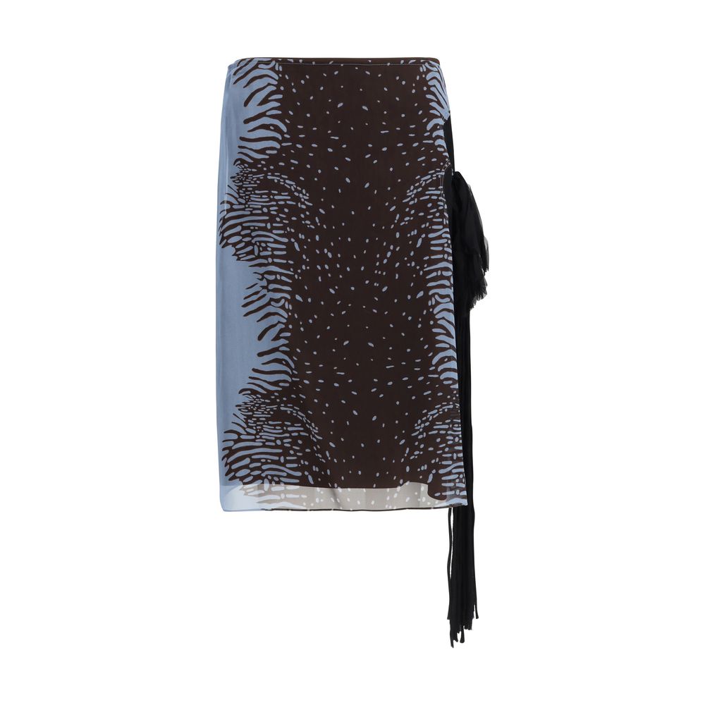 The Flower Skirt by Ferragamo is made of silk-blend georgette, characterized by clean lines and a contrasting animal print placed along the sides. The model features a flower-shaped inlay on the left side, with silk petals and long tubular pistils that create a free-moving fringe. The side closure with an invisible zip maintains a clean design and a regular fit. An elegant skirt, suitable for formal outfits, events, and special occasions.